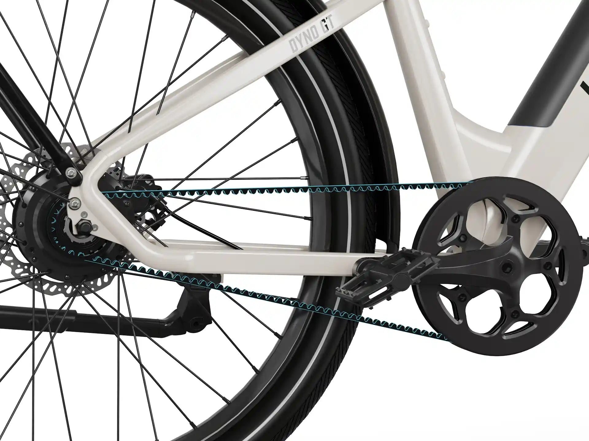Napęd w modelu Dyno GT opiera się na pasku węglowym, który łączy lekkość z wyjątkową trwałością. Odporny na ścieranie, nie wymaga smarowania, może wytrzymać do 30 000 km, zachowując pełną wydajność. Dzięki redukcji tarcia oraz hałasu jazda staje się płynniejsza i cichsza. Nawet w trudnych warunkach pogodowych pasek zachowuje swoje właściwości, co przekłada się na dłuższą żywotność układu napędowego.
